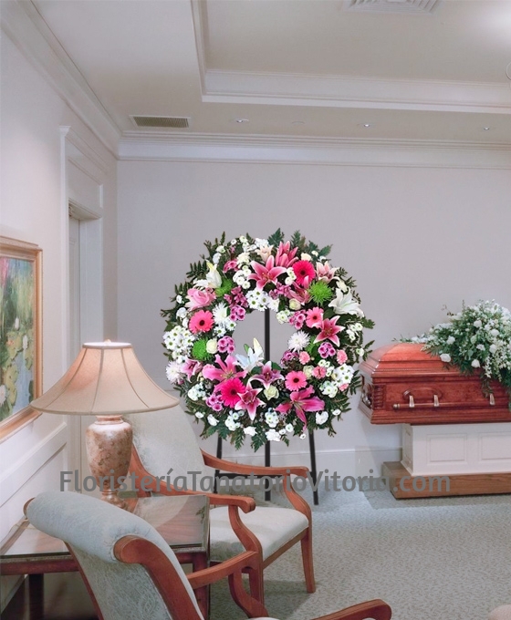 Enviar Coronas Funerarias es una forma de despedirse del difunto y dar consuelo a la familia, En Floristeria Tanatorio Vitoria contamos con esta Elegante, Fino y Perfecta para este tipo de ocasiones, Corona Funeraria Flor Variada Rosa está compuesta por Flor para Funeral de calidad, Gerberas, Liliums, Margaritas, Rosas y Claveles, además cuenta con la mejor calidad de Flor para Funeral gracias a nuestros proveedores, tanto a nivel nacional como internacional.